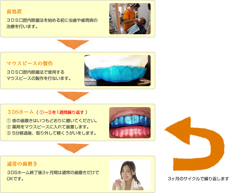 3DS口腔内除菌法は、クリーニング後に残っているこれらの細菌を局所的に除菌するため、効率的に口腔内を清潔な状態に保つことができます。